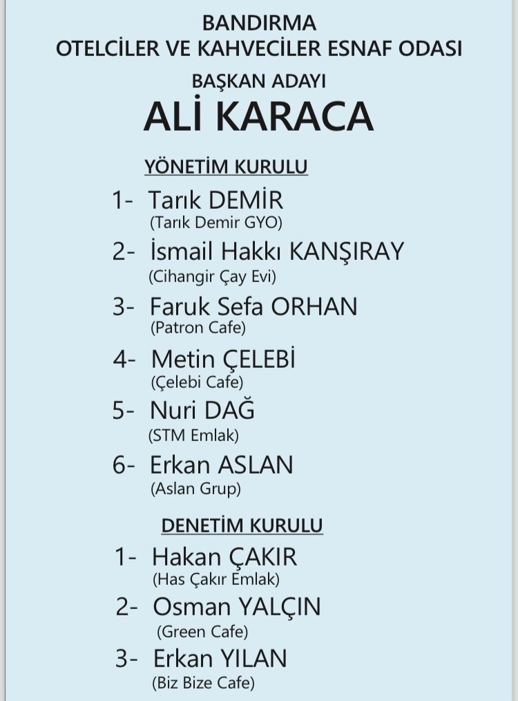 Bandırma Kahveciler ve Otelciler Esnaf Odası Başkan Adayı Ali Karaca yaklaşan oda seçimleri öncesinde yönetim kurulu aday listesini kamuoyu ile paylaştı.