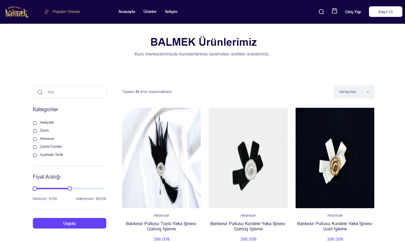 “Binbir Emek BALMEK” sloganıyla hizmete açılan online satış mağazasında her bütçeye uygun el emeği ürünler yer alıyor. BALMEK kursiyerlerinin yöresel motiflerle süsleyerek ürettikleri hediyelikler, giyim, takı, aksesuar, çanta ve ayakkabılar satışa sunuldu. Masa örtülerinden çantalara kadar pek çok üründe Coğrafi İşaretli Balıkesir Pullusu ile gümüş ve gold işleme detayları dikkat çekiyor. Balıkesir’in kültürel motiflerinin yer aldığı el emeği ürünler çeşitlilikleriyle de ön plana çıkıyor.