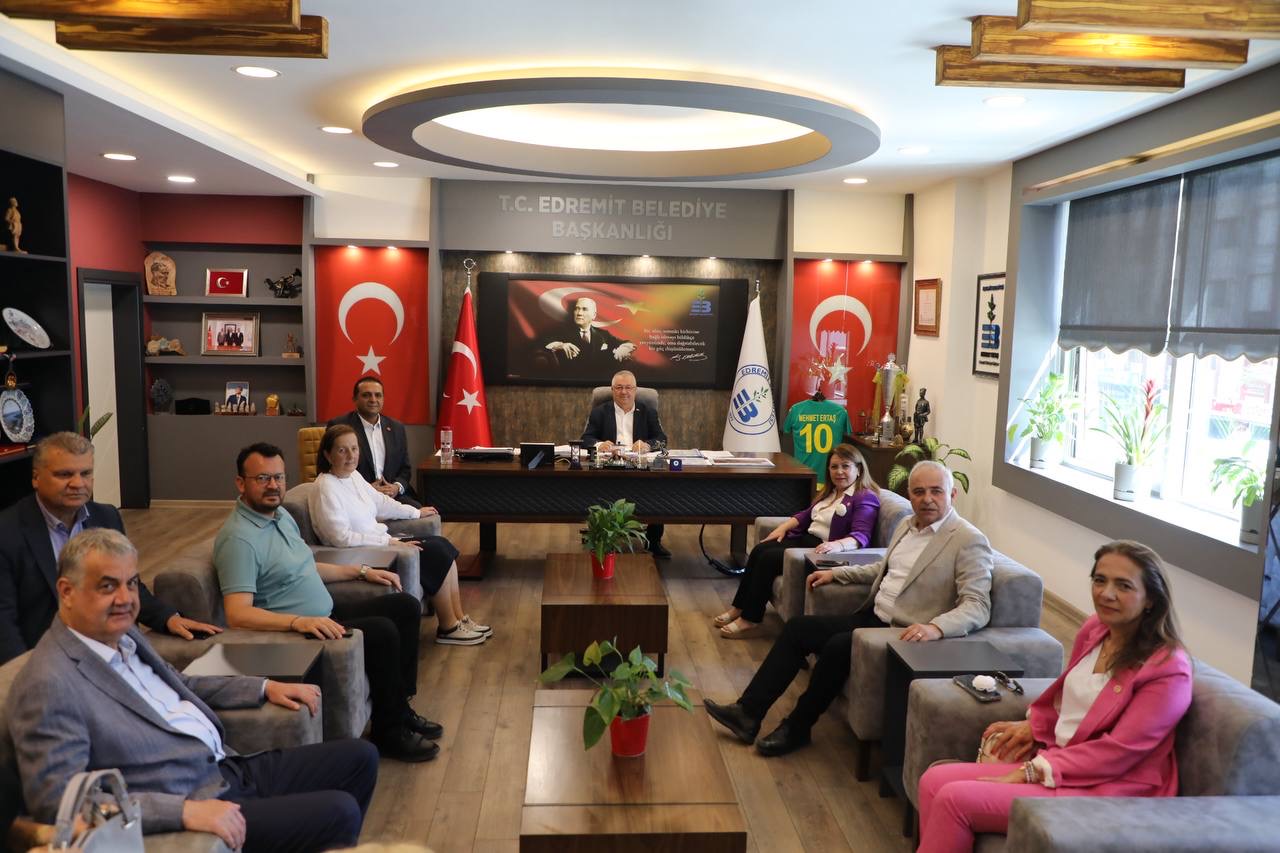 Edremit Belediye Başkanı Mehmet Ertaş, belediyenin çalışmaları, vizyonu ve projeleri hakkında milletvekillerine bilgi verdi. Başkan Ertaş, “Kıymetli vekillerimizle kentimizin ihtiyaçlarını değerlendirdik. Dayanışma ve iş birliğimizi güçlendirmek üzere her zaman yanımızda olan, birlik ve beraberlik içerisinde çalışacağımız vekillerimize nazik ziyaretleri nedeniyle teşekkür ediyorum.” dedi.