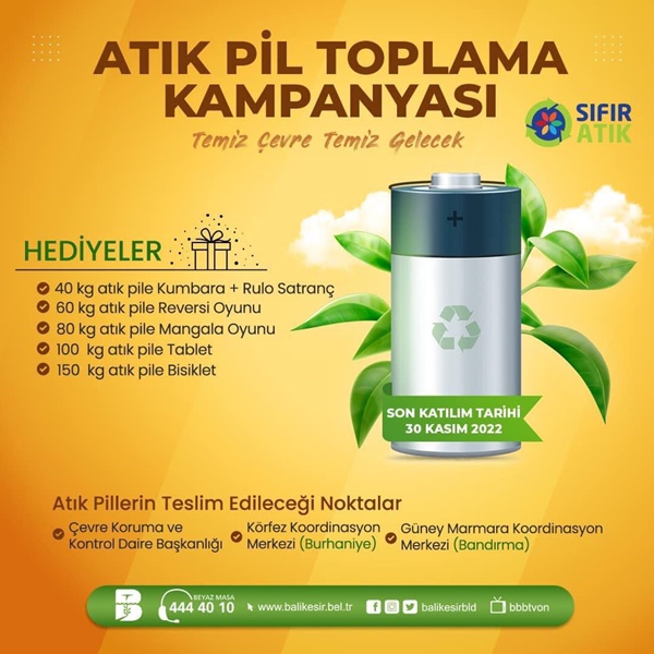 Balıkesir Büyükşehir Belediyesi, ‘Temiz Çevre Temiz Gelecek’ sloganıyla ödüllü atık pil toplama kampanyası başlattı. Tablet ve bisiklet gibi ödülleri kazanmak isteyenler 30 Kasım 2022 tarihine kadar toplama noktalarına pilleri ulaştırması gerekiyor.