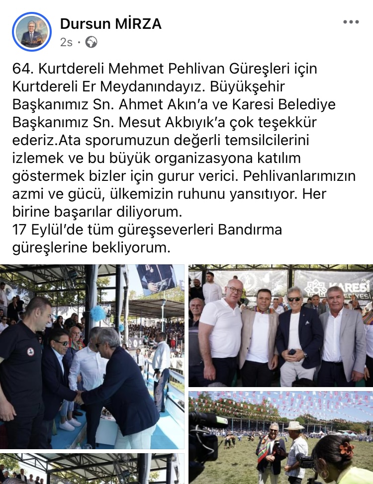 64. Kurtdereli Mehmet Pehlivan Güreşleri için Kurtdereli Er Meydanında güreşleri takip eden Bandırma Belediye Başkanı Dursun Mirza kendi sosyal medya hesabından yaptığı açıklama da
