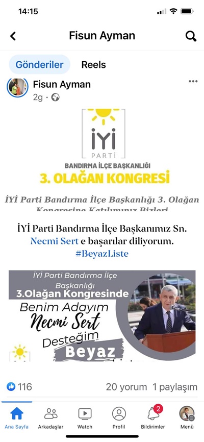 İYİ Parti Balıkesir İl Başkanı Özlem Ural’ın ilçe kongrelerinde tarafsız olduğunu dile getirmesine rağmen İl Başkan Yardımcıları Nezahet Özay ve Fisun Ayman’ın tarafgir paylaşımı parti tabanında tepkilere neden oldu. Adaylardan Faruk Tan, “Maalesef tarafsız olması gereken il yöneticilerimizin ilçe kongresine sayılı günler sosyal medya hesaplarından yaptıkları paylaşımlarla delegelerimizin iradesini ipotek altına alma gayretlerini üzüntüyle takip etmekteyiz. Delegelerimizin genel kurulumuzda koltuk siyaseti yapma düşüncesi içerisinde olanlara en güzel cevabı sandıkta vereceğinden kimsenin şüphesi olmasın” dedi.