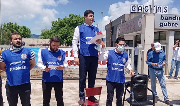Çevre ve Şehircilik Bakanlığı tarafından çevreyi kirlettiği gerekçesiyle üretimine ara verilen Bandırma Gübre Fabrikaları’nın (BAGFAŞ) önünde işçilerden basın açıklaması. Çok sayıda işçi ve ailelerinin atıldığı basın açıklamasında jandarma geniş güvenlik önlemi aldı. Basın açıklaması Petrol İş Sendikası Bandırma Şube Başkanı İlyas Satırlı tarafından okundu. Satırlı “Petrol İş Sendikası Marmara Denizi’nde bir süredir ortaya çıkan deniz salyası sorunu en başta Bandırma halkını üzmektedir. Marmara Denizi, bizlere geçmiş kuşaklardan miras kalan büyük bir doğal zenginliğimizdir. Marmara’nın ölmesine izin veremeyiz. Bu çerçevede, gereken önlemler derhal alınmalı, teknik çalışmalar devreye sokulmalı ve ihtiyaç duyulan yatırımlar için kolaylıklar sağlanmalıdır.” dedi.